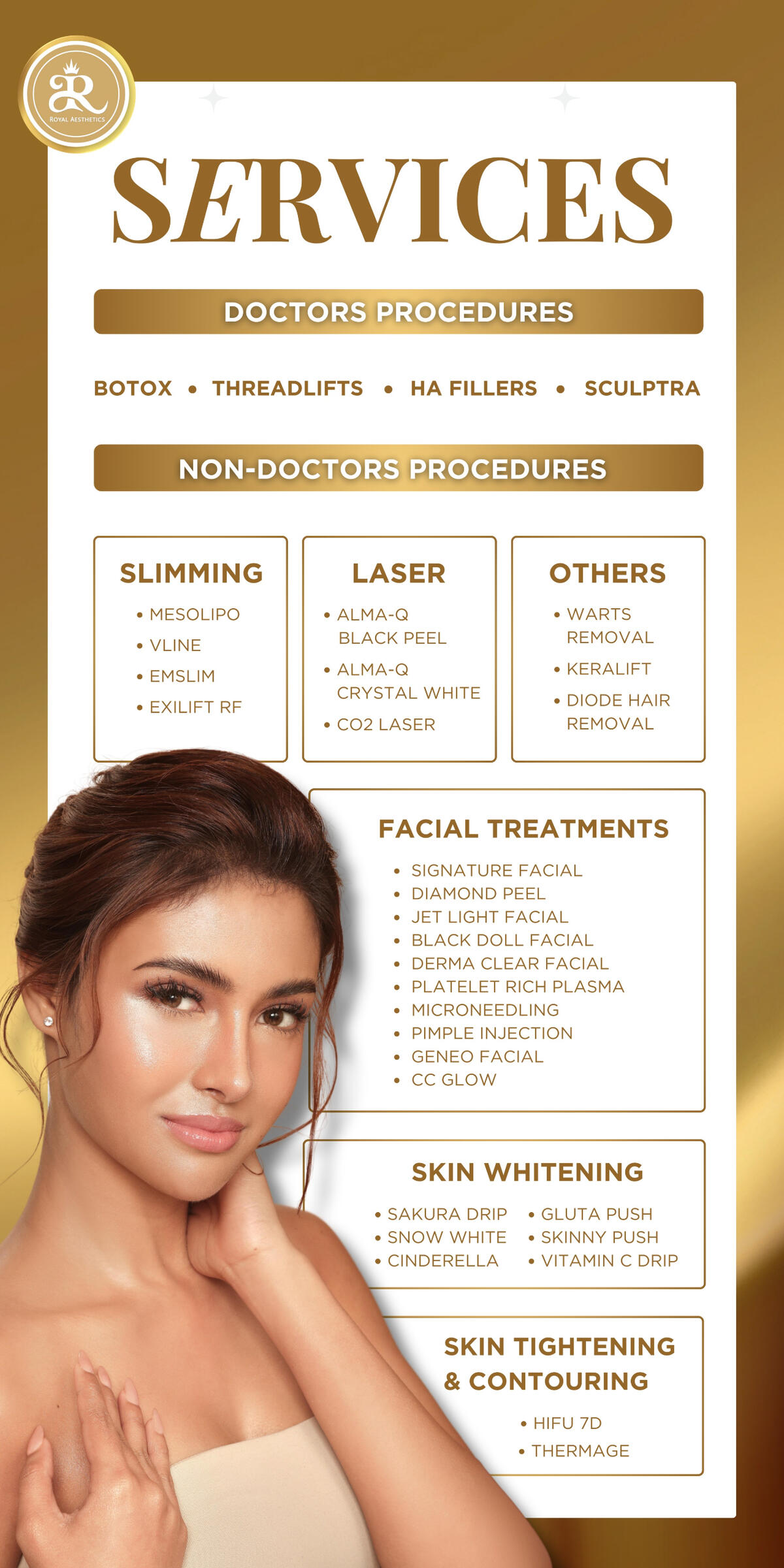 Royal Aesthetics is a multi-awarded beauty and wellness clinic that offers exemplary complete skin care treatments that include dermatology, plastic surgery, and non-surgical aesthetic services performed by internationally recognized, highly-equipped Licensed Medical Doctors assisted by well-trained and approachable staff.The clinic is known for its top-tier services, innovative equipment, and advanced treatments that provide promising results, and immediate confidence without having to break a bank.Your way to become #royalisticallybeautiful is here!